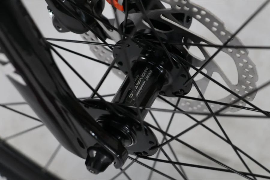 Xe sử dụng phuộc dầu vai nhôm có khóa hành trình, giúp hấp thụ chấn động hiệu quả khi di chuyển trên địa hình gồ ghề và tăng độ ổn định trên đường bằng. Khóa hành trình cho phép người lái điều chỉnh phuộc theo nhu cầu sử dụng, tối ưu hóa trải nghiệm đạp xe.
