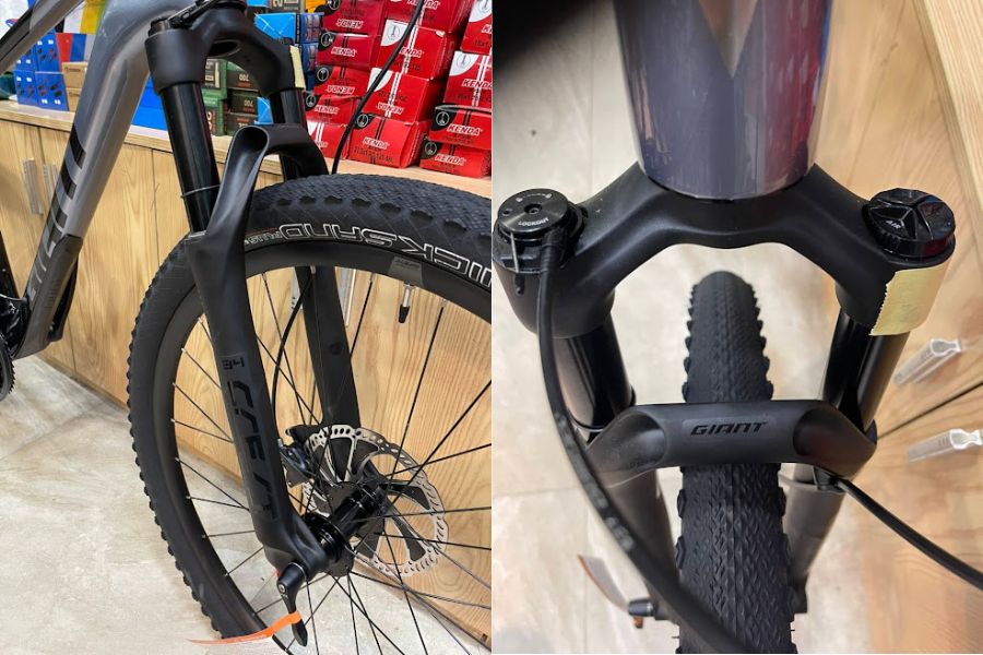 Xe được trang bị phuộc trước bằng hợp kim Magie Giant Crest với hành trình 100mm, giúp hấp thụ chấn động hiệu quả khi di chuyển trên địa hình gồ ghề. Tính năng khóa phuộc cho phép người lái điều chỉnh độ cứng mềm phù hợp với từng loại địa hình, tối ưu hóa hiệu suất đạp.