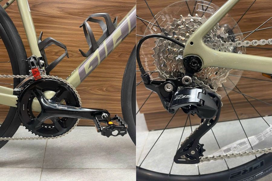 Bộ truyền động Shimano 105 và hệ thống phanh đĩa thủy lực đảm bảo xe vận hành êm ái, chính xác và an toàn ngay cả trong những điều kiện khó khăn như đường trơn trượt hoặc địa hình phức tạp.