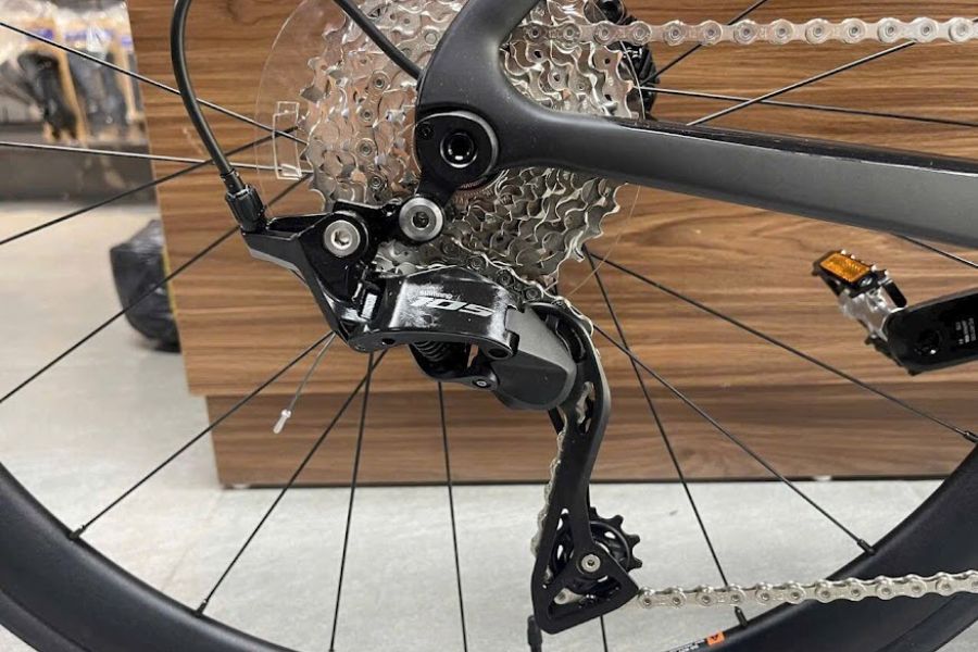 Bộ truyền động Shimano 105 với 11 tốc độ cho phép người lái dễ dàng điều chỉnh tốc độ và sang số nhanh chóng, giúp tiết kiệm năng lượng và tăng hiệu suất trong các cuộc đua.