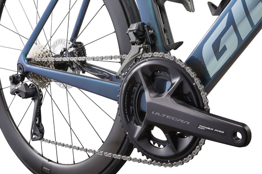 - Đùi đĩa Shimano Ultegra 36/52T, tích hợp đồng hồ đo công suất Giant Power Pro, hỗ trợ tối ưu hóa hiệu suất đạp.