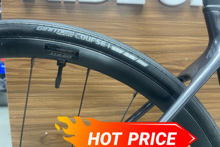 Bánh xe Giant P-R2 Disc kết hợp lốp không săm Giant Course 1 tubeless kích thước 700x25c, giúp tăng cường độ bám, giảm ma sát và giảm nguy cơ thủng lốp, mang lại sự an toàn và tốc độ tối ưu.