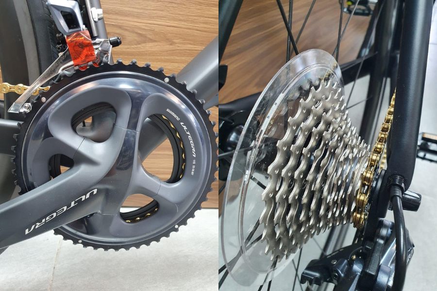 Xe sử dụng bộ truyền động Shimano Ultegra 2×11 tốc độ, đảm bảo khả năng chuyển số mượt mà và chính xác trong mọi tình huống. Với tỷ lệ đĩa 34/50T và líp 11-34T, hệ thống này phù hợp cho cả việc tăng tốc nhanh và leo dốc hiệu quả.