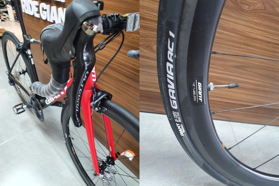 Bánh xe Giant SLR 1 42 Carbon Disc WheelSystem kết hợp với lốp không săm Giant Gavia Course 1 tubeless 700x25c, mang lại sự cân bằng hoàn hảo giữa tốc độ và độ bám đường. Thiết kế này không chỉ giúp giảm nguy cơ thủng lốp mà còn tăng cường hiệu suất trên đường trường.