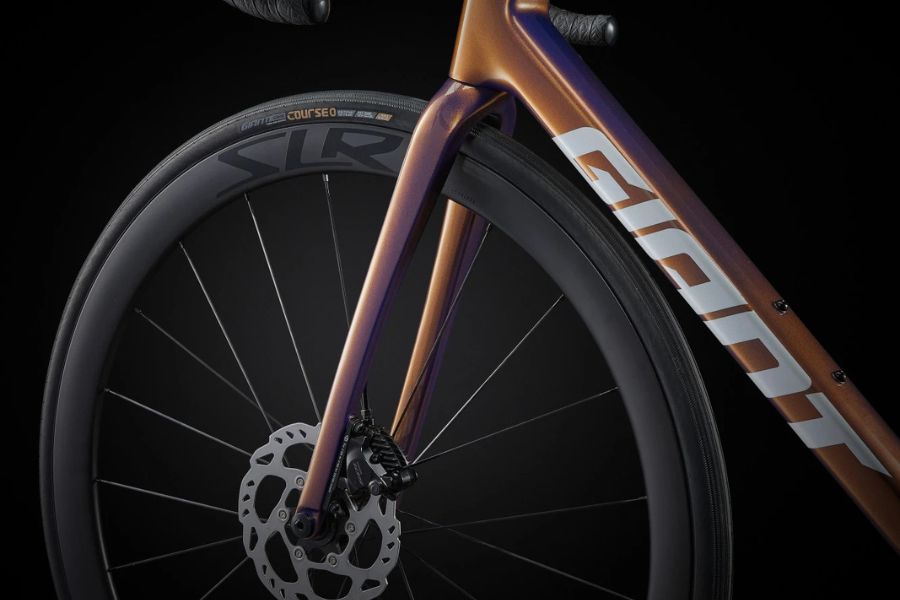 Xe được trang bị phuộc Advanced SL-Grade Composite giúp tối ưu hiệu suất đạp và giảm trọng lượng. Hệ thống bánh xe Giant SLR 1 40 Carbon Disc kết hợp với lốp Giant Gavia Course 0 tubeless giúp tăng độ bám đường và cải thiện khả năng xử lý tình huống trên các cung đường khó khăn.