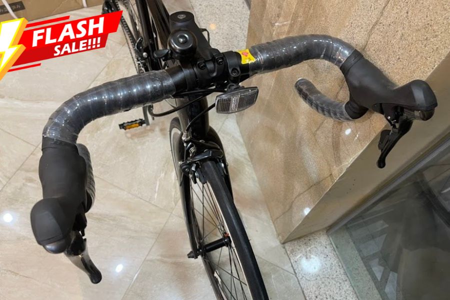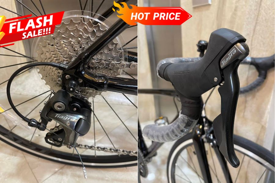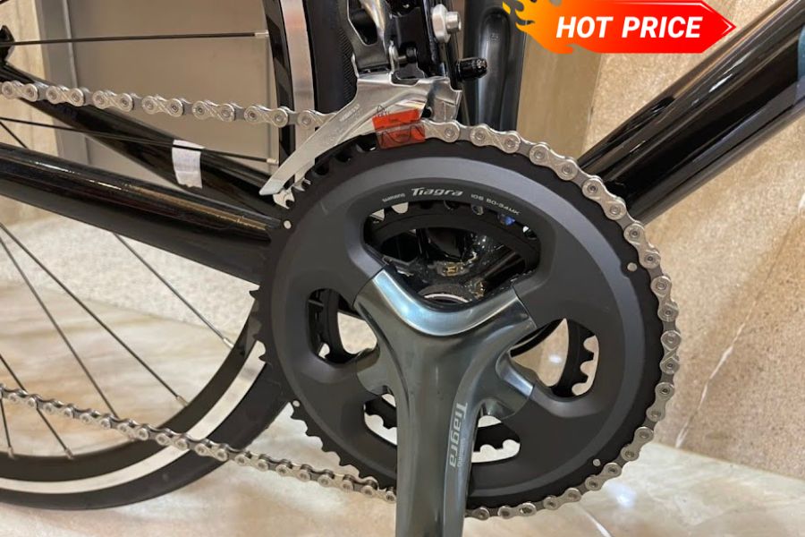Xe được trang bị bộ truyền động Shimano Tiagra với 2 đĩa và 10 líp, mang lại khả năng chuyển số mượt mà và chính xác. Hệ thống này hỗ trợ tối ưu cho các cung đường bằng và cả khi leo dốc, giúp tay đua dễ dàng điều chỉnh tốc độ phù hợp.