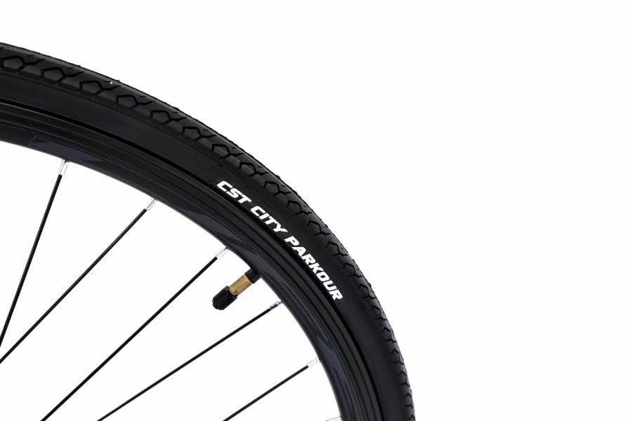 Vành xe làm từ nhôm 2 lớp, cao 25mm và lốp xe CST CITY PARKOUR 700x25C, đảm bảo độ bền và khả năng bám đường tốt. Những thành phần này giúp xe vận hành ổn định và an toàn trên mọi địa hình.