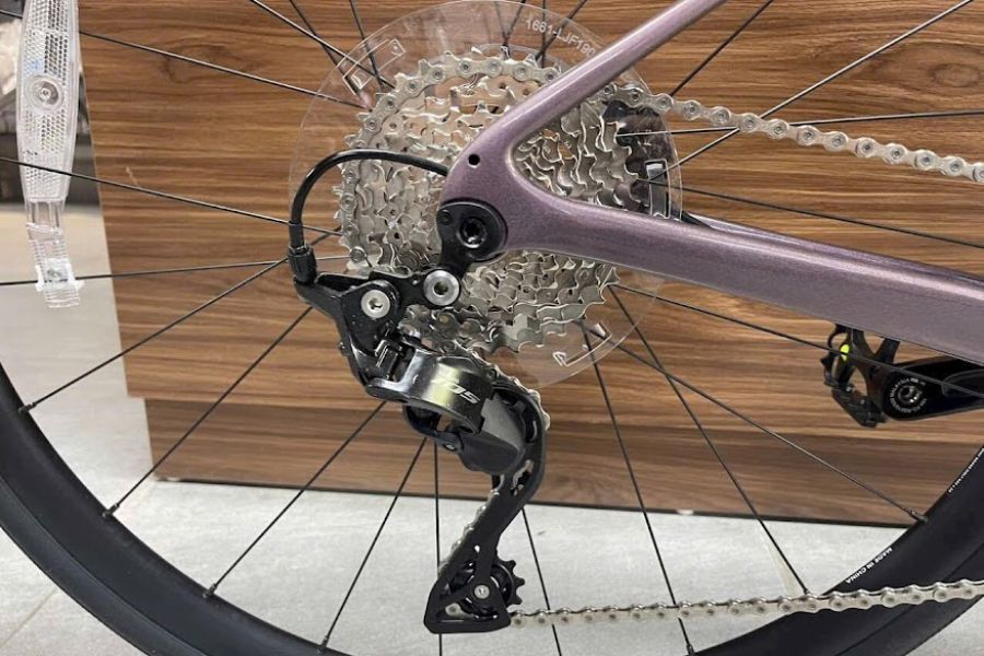Xe sử dụng bộ truyền động Shimano 105 2×12 tốc độ, giúp chuyển số mượt mà, chính xác, phù hợp với nhiều điều kiện địa hình khác nhau.