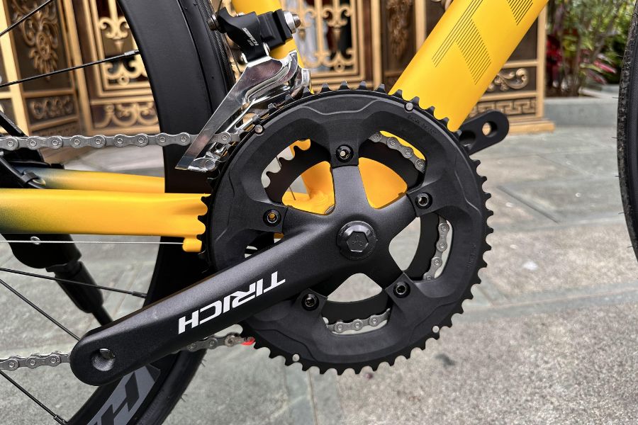 Hệ thống đùi đĩa nhôm 2 tầng 34x50T kết hợp với líp thả 20 tầng mang lại khả năng tăng tốc nhanh chóng, phù hợp cho cả đường bằng và các cung đường đồi dốc.