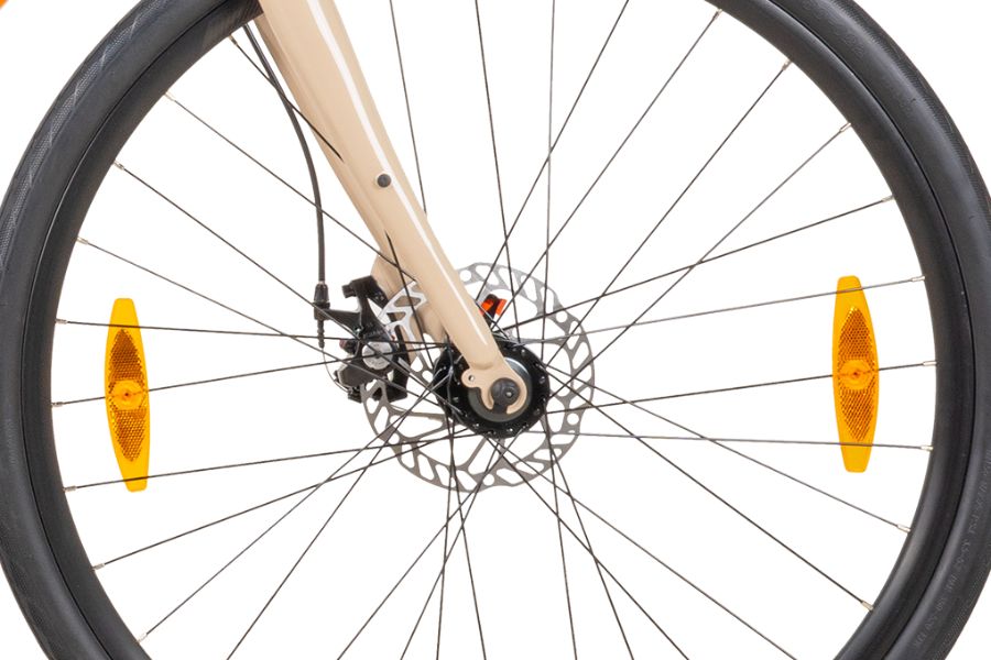 Hệ thống phanh sử dụng phanh đĩa cơ Tektro, cung cấp lực phanh mạnh mẽ và độ chính xác cao, đảm bảo an toàn trong mọi điều kiện thời tiết và địa hình.