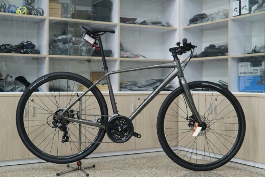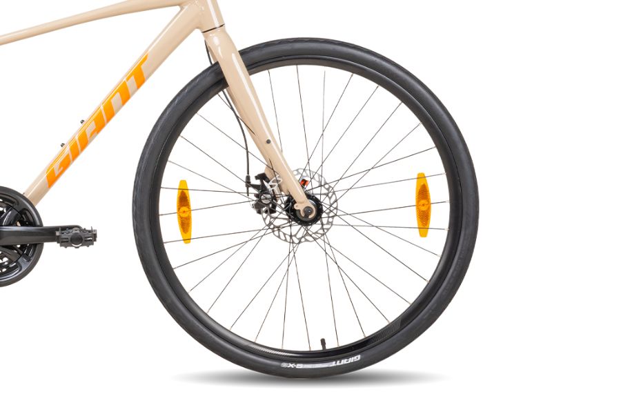 Bánh xe gồm vành hợp kim nhôm 2 lớp, moay ơ hợp kim nhôm và lốp Giant S-X3 700x38C, đảm bảo độ bền và khả năng bám đường tốt, giúp xe vận hành ổn định và an toàn.