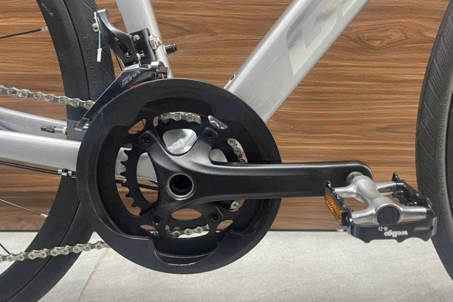 Bộ truyền động Shimano Sora 2x9S mang lại khả năng chuyển số mượt mà và chính xác. Với đùi đĩa hợp kim nhôm 48/32T và líp SHIMANO HG201-9 11-34T, xe dễ dàng vượt qua các cung đường dốc hoặc tăng tốc nhanh chóng trên đường thẳng.