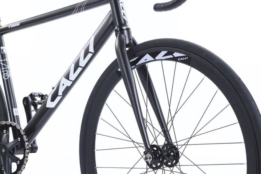 Xe đạp Fixed Gear Calli F3000 được trang bị vành xé gió 40mm, nhôm 2 lớp CALLI và lốp CST RECOURSE 700*28C. Thiết kế này giúp tăng độ bám đường, giảm rung động khi đi trên các bề mặt không bằng phẳng, đồng thời tăng cường sự ổn định khi di chuyển ở tốc độ cao.