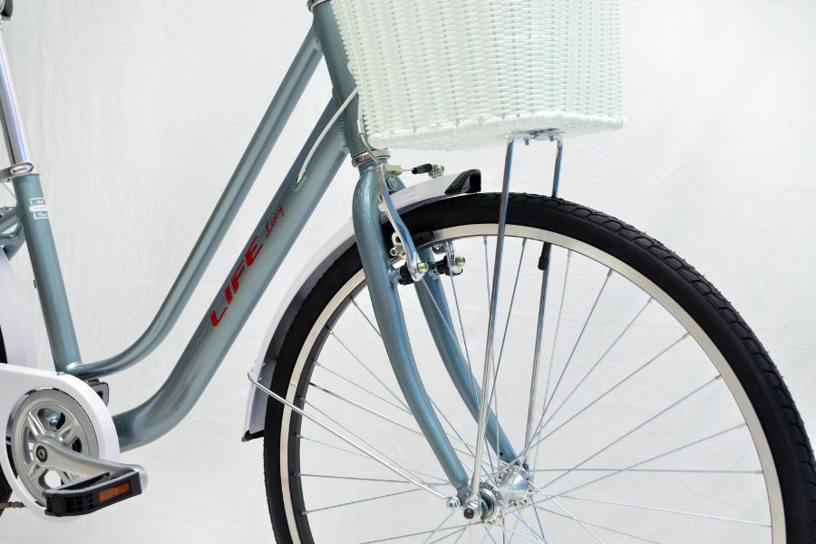 Xe đạp mini nữ Life Lucy được trang bị vành xe 26 inch làm từ hợp kim nhôm hai lớp, mang lại độ cứng cáp và bền bỉ, giúp xe vận hành ổn định ngay cả khi chở hàng nặng. Vành xe lớn còn giúp xe lướt đi nhẹ nhàng, giảm thiểu lực cản, tiết kiệm năng lượng cho người lái.