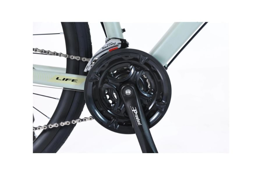Đùi đĩa PROWHEEL với trục rỗng và xích Narrow trên xe đạp Touring Life City2 không chỉ bền bỉ mà còn giúp xe vận hành ổn định. Thiết kế này giảm trọng lượng xe và tăng hiệu suất đạp, đồng thời dễ dàng bảo trì.