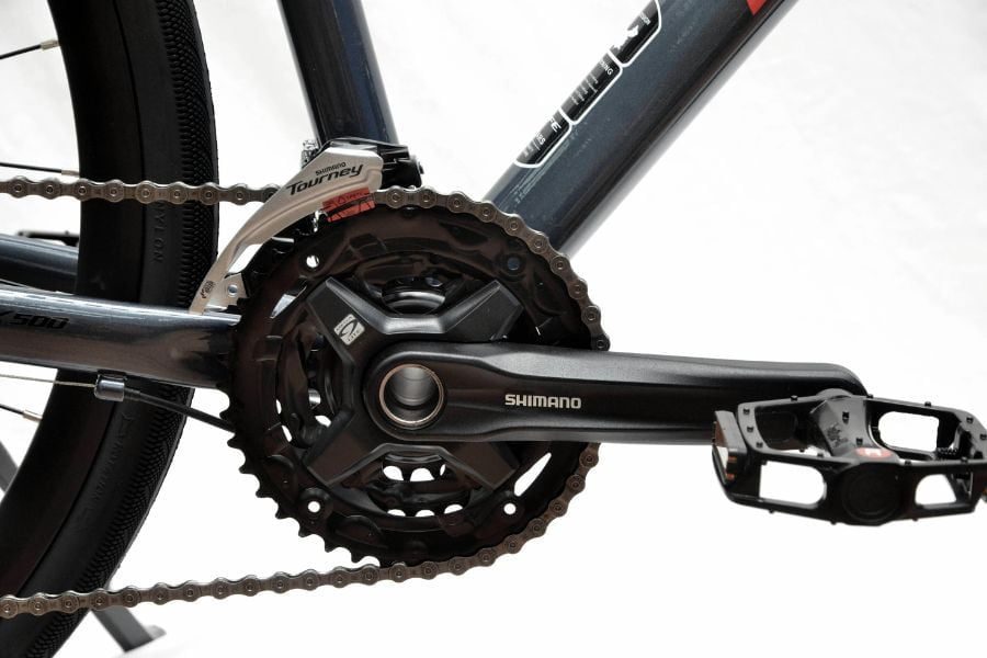 Đùi đĩa Shimano MT201/MT300 với trục rỗng và xích Narrow DYC trên xe đạp Touring Life TX500 đảm bảo sự bền bỉ và hiệu suất cao trong suốt quá trình sử dụng. Bộ truyền động này giúp xe vận hành ổn định và dễ dàng bảo trì.